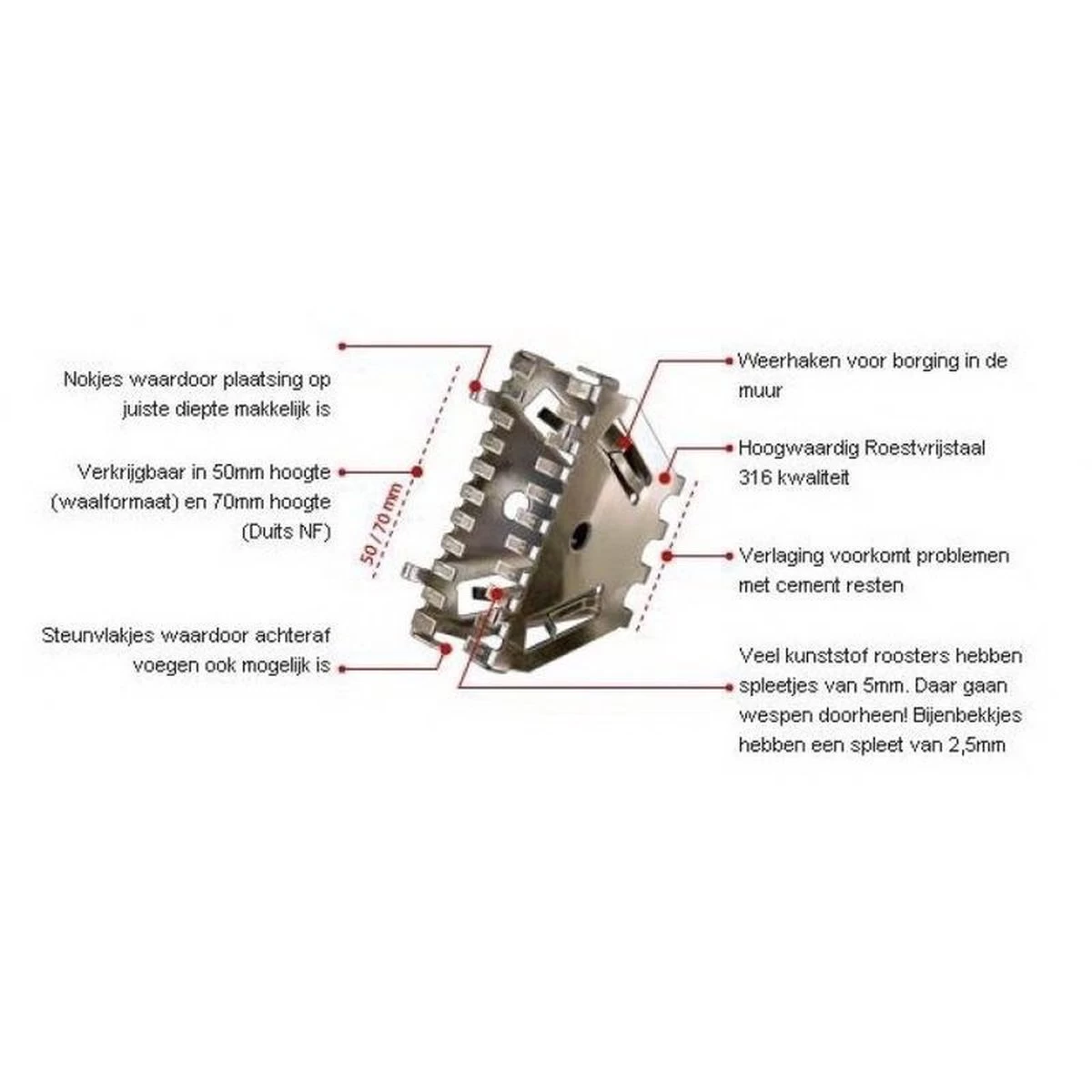 Deze roestvrijstalen bijenbekjes zorgen ervoor dat ongedierte, in de vorm van bijvoorbeeld muizen, wespen en spinnen, niet in de spouw belanden. De spouw is de ruimte tussen uw binnenmuur en buitenmuur. De weerhaken zorgen ervoor dat de bijenbekjes geborgen zijn. Het rooster zal zich aanpassen aan de breedte van de voeg tussen de 5-12 mm. Als de voeg niet helemaal recht zit is dat geen probleem, als de opening maar genoeg afsluit. Om het bijenbekje te plaatsen knijpt u deze samen totdat het in de stootvoeg past. De roostertjes zijn zowel tijdens als na het metselen te plaatsen. Tip: – Meet eerst de stootvoegen op alvorens u een bestelling plaatst. Beslis dan welk formaat u nodig heeft. – Controleer voordat u een stootvoegrooster plaatst of er geen nest aanwezig is in uw spouw.