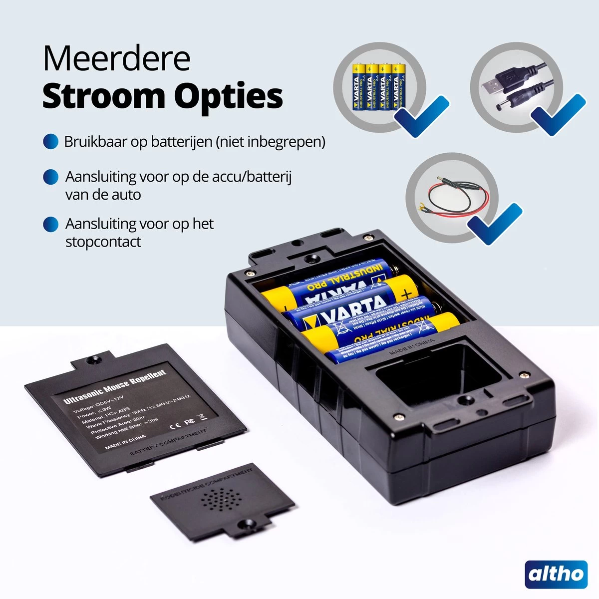 - Meerdere stroomopties – De Altho verjager kan op 3 verschillende manieren van stroom worden voorzien, namelijk via het stopcontact met een USB adapter, op de accu van de auto of op batterijen die je in het toestel kunt plaatsen. De 4 batterijen zijn niet inbegrepen.