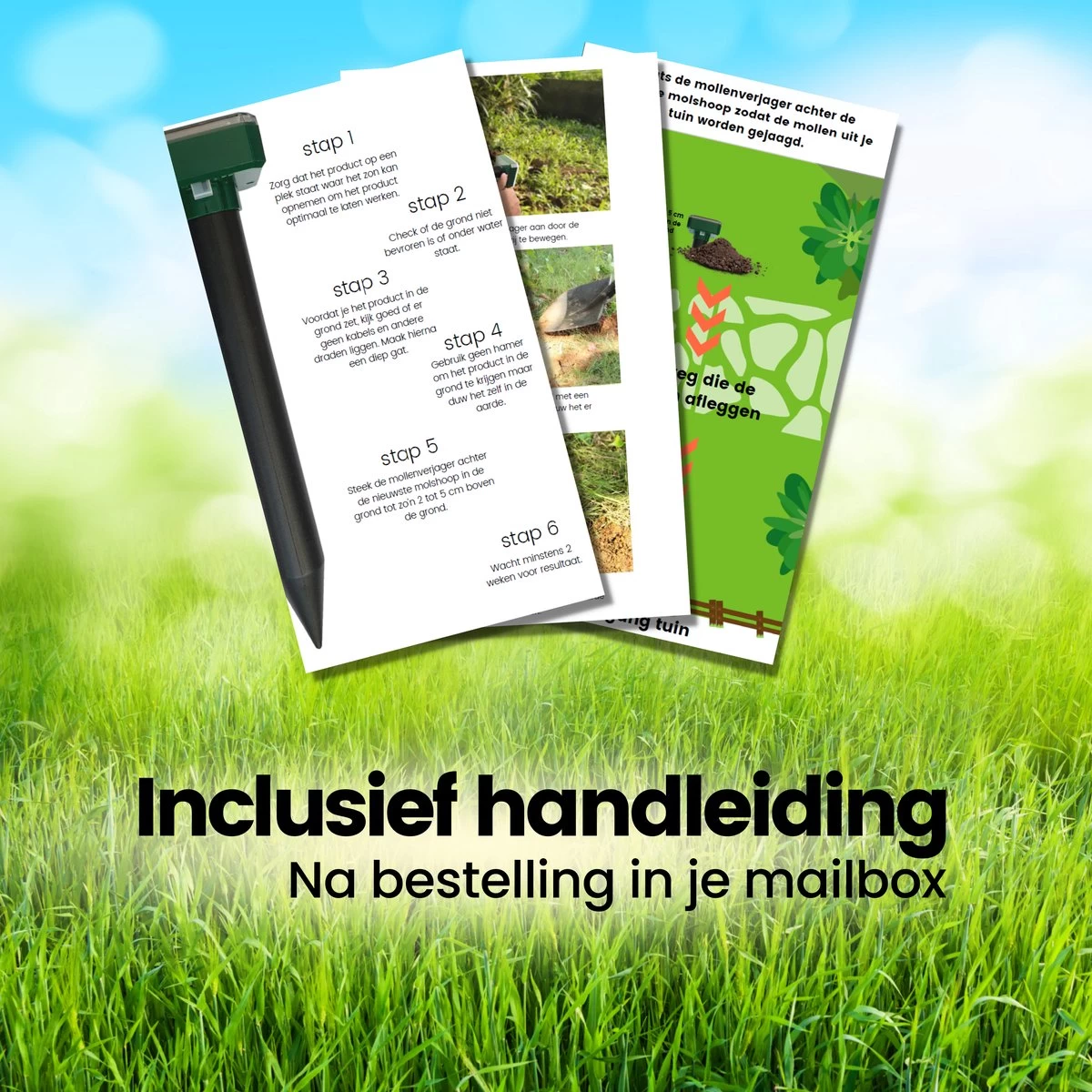 De mollenverjagers plaats je het beste achter de nieuwste molshopen. Na de installatie van het product kan het voorkomen dat er meer molshopen ontstaan dan voorheen. Dit is een logisch effect van het vluchtgedrag van de mol die zo snel mogelijk probeert om weg te komen en hierdoor meer molshopen creëert. Na 2 tot 4 weken zul je zien dat dit afneemt en de mollen vanzelf zullen verdwijnen. Is dit niet het geval? Verplaats de mollenverjager dan naar een andere plek.