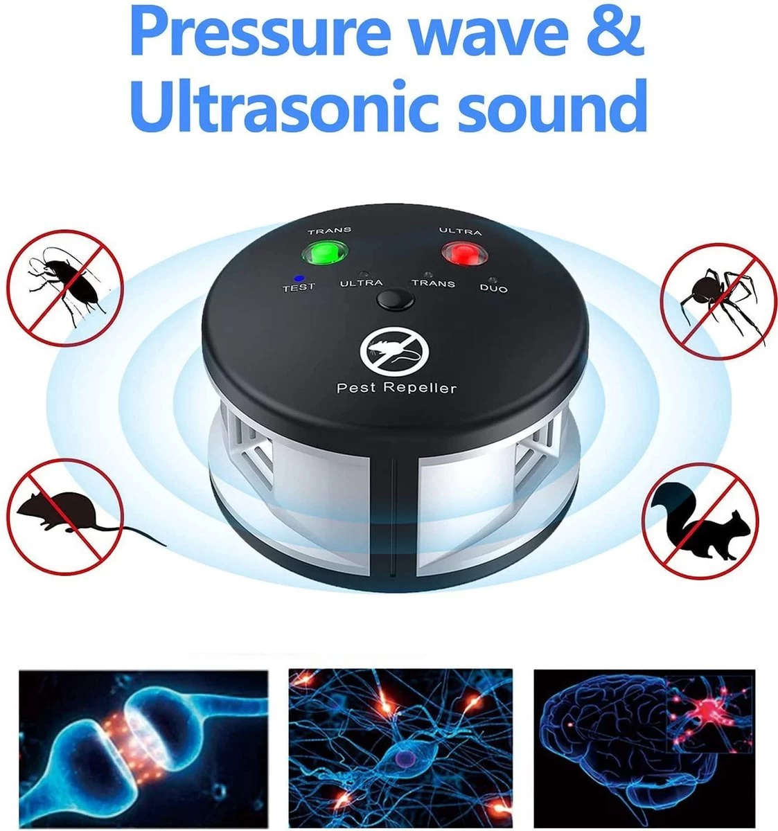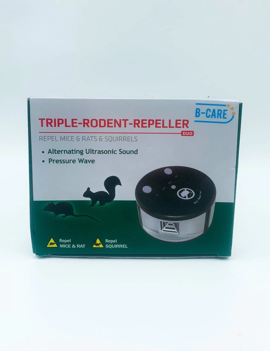 De B-care muizenverjager kan ook andere ongewenste dieren verjagen, zoals eekhoorns, mieren en kakkerlakken. Het ultrasone geluid is namelijk op verschillende frequenties in te stellen. Het ene dier reageert op een andere frequentie dan het andere dier. Er kan een test tone worden afgespeeld zodat u het product kan testen. Verder heeft u 3 verschillende opties: ultra sound geluid, drukgolven en een combinatie van ultrasone en drukgolven.