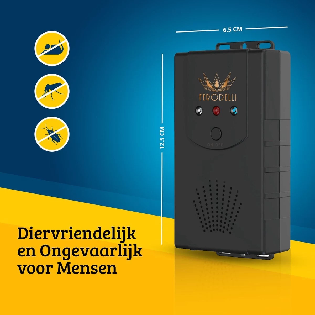De verjager van Ferodelli® zendt geluid uit op hoge frequentie. Deze geluiden zijn niet schadelijk voor mensen of dieren, maar verjagen knaagdieren, ongedierte en zelfs insecten. Dankzij de verstelbare frequentie wennen de dieren niet aan de frequentie waardoor deze effectief blijft.