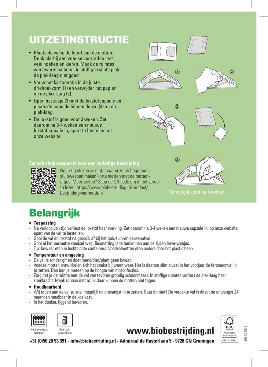 Plaats de val in de buurt van de voedselwaren, bijvoorbeeld in de inloopkast. De val is zo’n 3-4 weken actief. Denk erom dat de val zijn werking verliest in zeer stoffige ruimtes aangezien het stof op de lijm terecht komt waardoor de lijm zijn kleefkracht verliest. Controleer de vallen regelmatig en vervang ze op tijd (om de 3-4 weken afhankelijk van de besmetting).
