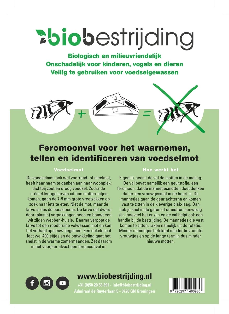 Voor het monitoren van voedselmotten binnenshuis hebben wij een feromoonval leverbaar. Deze feromoonval werkt heel simpel, de val is voorzien van lokstof waar de mannelijke motten op af komen. Zodra ze in de val zitten blijven ze plakken op het lijmgedeelte. Hiermee kunt u de voedselmotten waarnemen, tellen en identificeren. Daarnaast zal door het wegvangen van de mannelijke motten een rem gezet worden op de ontwikkeling van de motten aangezien er minder vrouwtjes bevrucht worden. Optioneel kan je deze val gebruiken in combinatie met de Trichogramma sluipwespen die parasiteren op de eitjes van de voedselmotten.