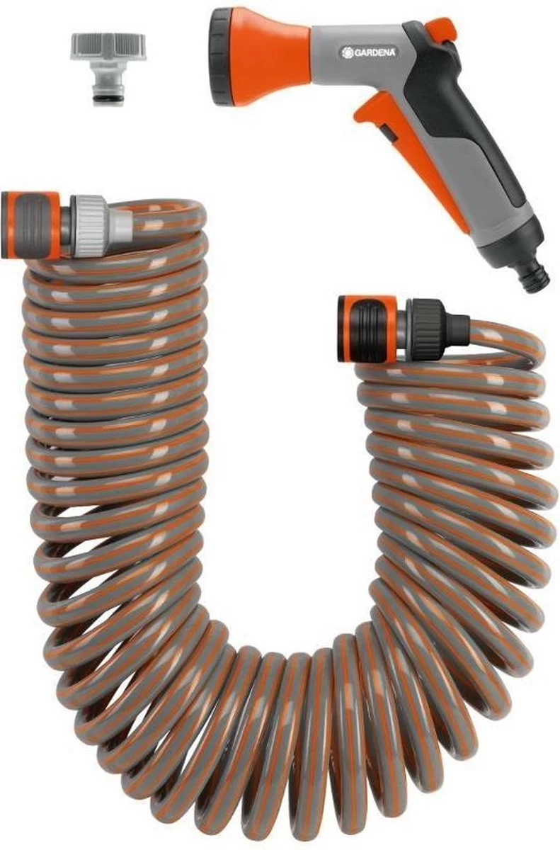 De spiraalslang-set is de handige oplossing voor het water geven van planten op balkons of terrassen of in zeer kleine tuinen. De slang wordt aan de muur gemonteerd. na gebruik veert de slang automatisch weer terug tot minimale afmetingen, dat maakt lastig op• en afrollen van de slang overbodig. De slanglengte is 10 m, ideaal voor het water geven van planten op kleine oppervlakken. de meegeleverde pistoolbroes ligt goed in de hand, de waterhoeveelheid kan traploos worden geregeld en de impulsgreep kan desgewenst worden ingesteld. De gardena spiraalslang-set is het praktische en complete systeem voor het sproeien van kleine tuinparadijsjes. Met pistoolbroes (art.nr. 8120) en kraanstukken (art. nr. 900, 901 en 902).