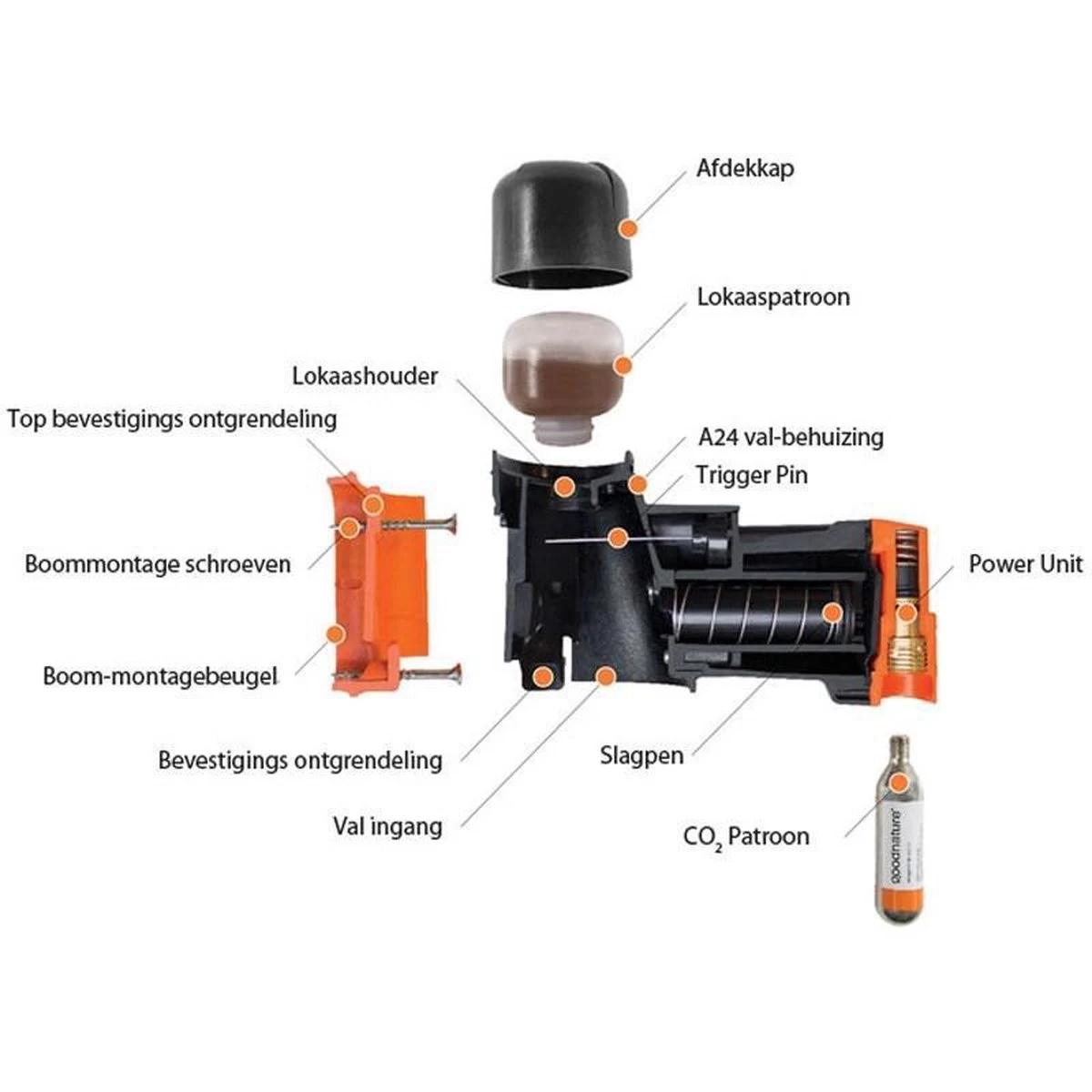 De val wordt geleverd met een houder die gemakkelijk aan een boomstam of houten paal kan worden gevestigd.