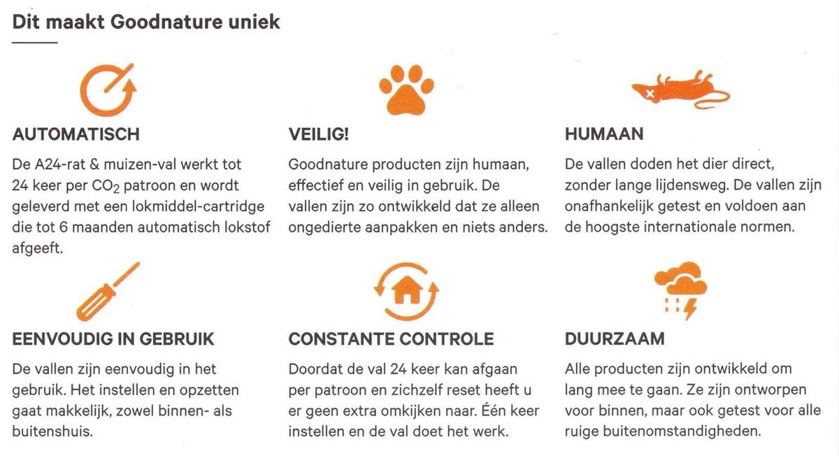 De Goodnature Trap is volledig mechanisch en bevat geen gif of andere gevaarlijke stoffen. Hierdoor kan hij binnen en buiten veilig ingezet worden om ratten en muizen te bestrijden. Het ontwerp is zo gemaakt dat vogels of andere dieren dan knaagdieren de val niet kunnen activeren.