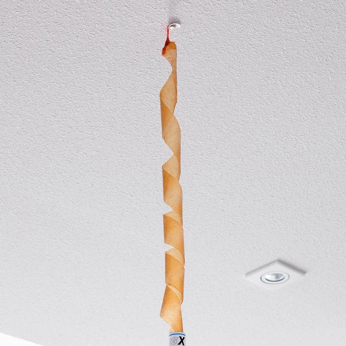 Pak het lusje van de vliegenvanger in een hand beet en de koker in de andere hand. Trek langzaam aan met een draaiende beweging aan het lusje. De kleefband komt nu uit het kokertje. Verwijder de punaise uit het losgekomen dekseltje en gebruik deze om de vanger aan het lusje op te hangen. Na het ophangen zal de vliegenvanger zich vanzelf rechttrekken.
