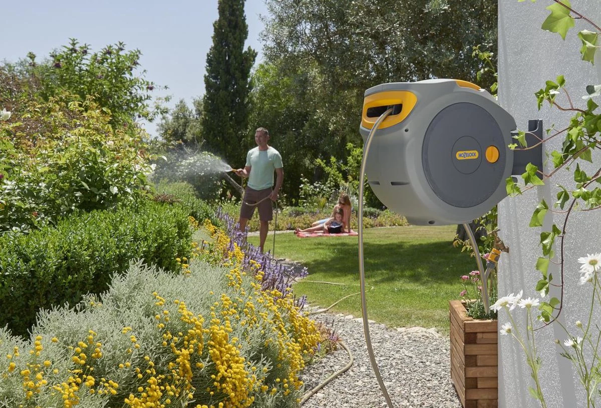 De Auto Reel 20 meter is een muurhaspel met automatisch slow rewind oprolmechanisme uitgerust met een 20 meter (Ø 12 mm) slang en 2 meter aanvoerslang voor de verbinding met de kraan en een mogelijkheid om uw aanvoerslang na gebruik weer netjes en drupvrij op te bergen in de geïntegreerde opbergruimte op het apparaat. De Slangenhaspel wordt geleverd met een gratis Hozelock broespistool!