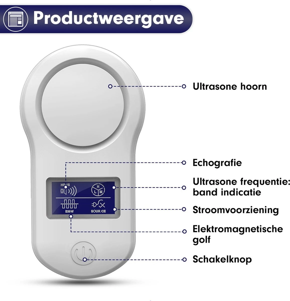 Een veilige manier om ongedierte in huis te bestrijden. Zeer geschikt voor een oppervlakte van 80 tot 120 vierkante meter. Door de 65Khz geluidsgolven die mensen niet kunnen horen, zorgt ultrasone technologie ervoor dat alle ongedierte uit je huis verdwijnt! U hoeft alleen de bestrijder in het stopcontact te steken en de rest van het werk wordt door de bestrijder gedaan.