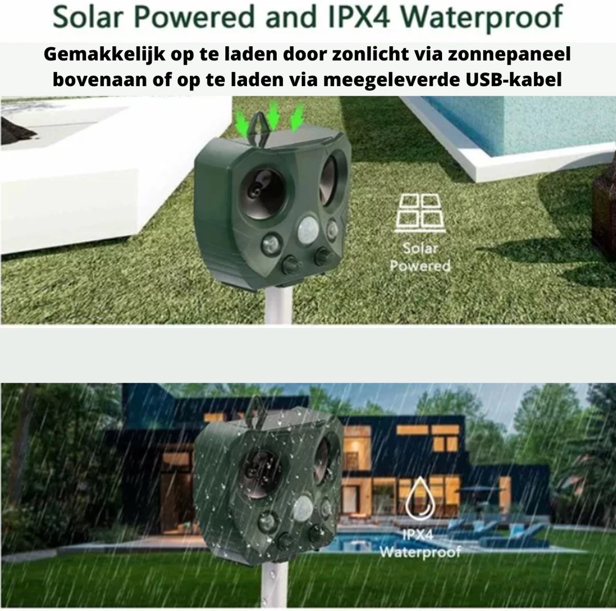 Wegens de ultrasone geluiden die zeer diervriendelijk en milieubewust zijn blijft het ongedierte uit uw buurt. Hoe werkt het nu precies? Door de infrarode bewegingsdetector start de ultrasone verzender zijn toon. Het ongedierte van het niet prettig om in deze toon aanwezig te zijn dus zal direct de voeten nemen zodat u er geen last meer van heeft.