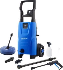 Deze hogedrukreiniger geeft maximaal 110 bar – efficiënt genoeg voor licht tot gemiddeld vervuilde oppervlakken.