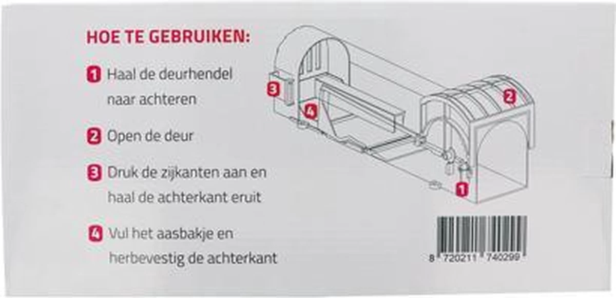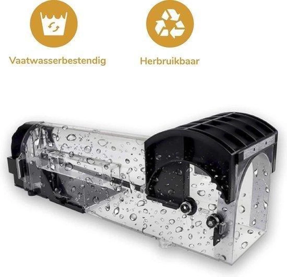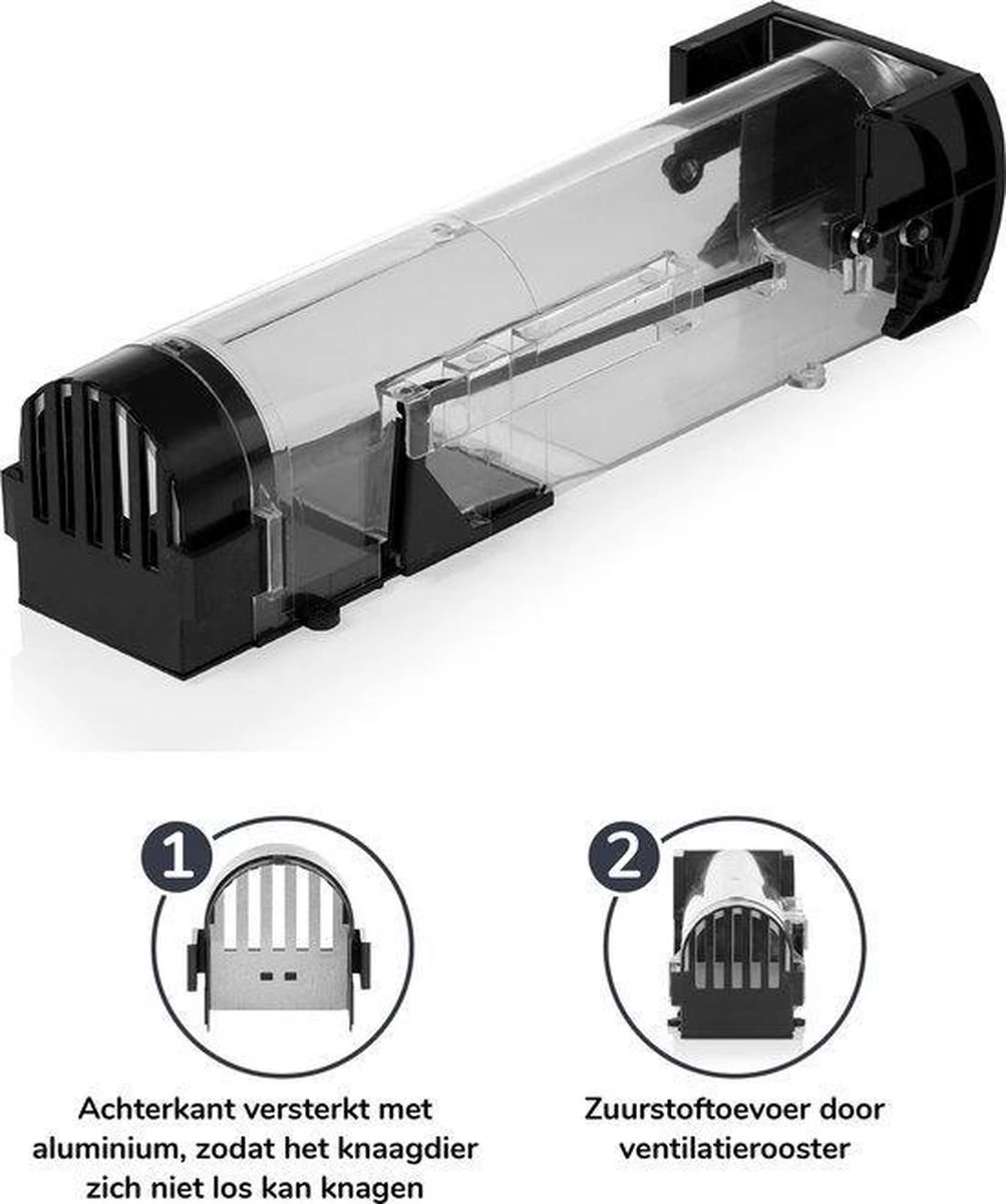 Je zet de muizenval met het grootste gemak. Druk de zijkanten van de val in om de achterkant te openen en vul vervolgens het aasbakje met aas. Plaats de achterkant van de val terug en open de valdeur door de hendel naar achteren te trekken. Dat is alles! De val is klaar voor gebruik. Dankzij het diervriendelijke design is de val niet gevaarlijk voor huisdieren en kinderen.