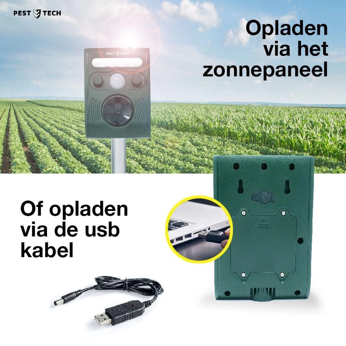 De Supersonische Kattenverjager werkt op batterijen, die worden heropgeladen met zonlicht. U kunt het apparaat ook aansluiten op het lichtnet, maar dan werkt de PIR-sensor niet. Dit is dan ook alleen aan te raden wanneer u het apparaat 24 uur lang elk kwartier wil laten afgaan. Heropladen kan ook met de bijgeleverde USB-kabel.