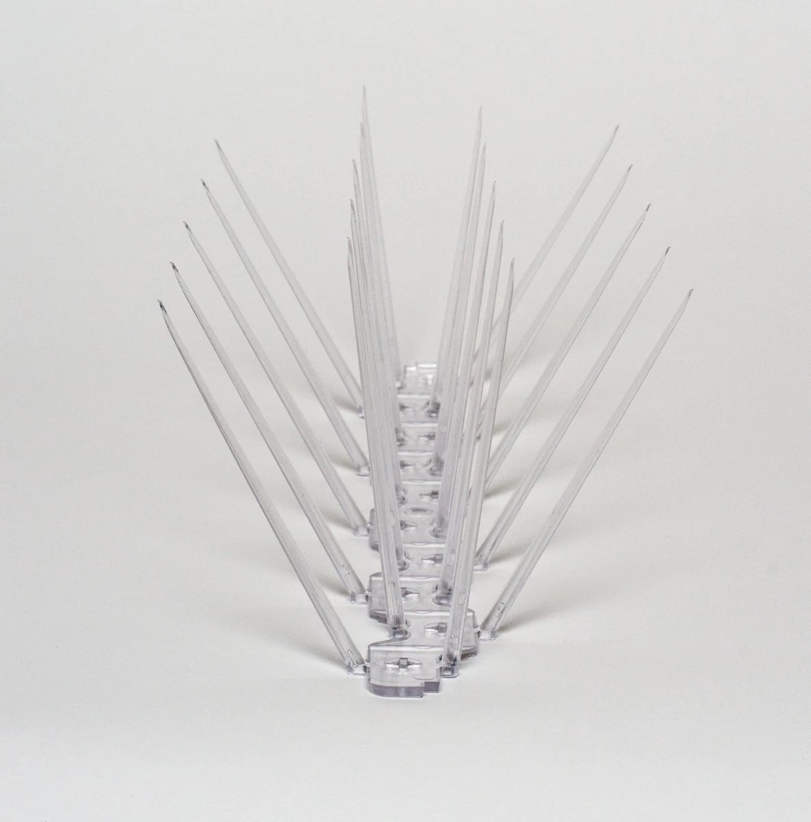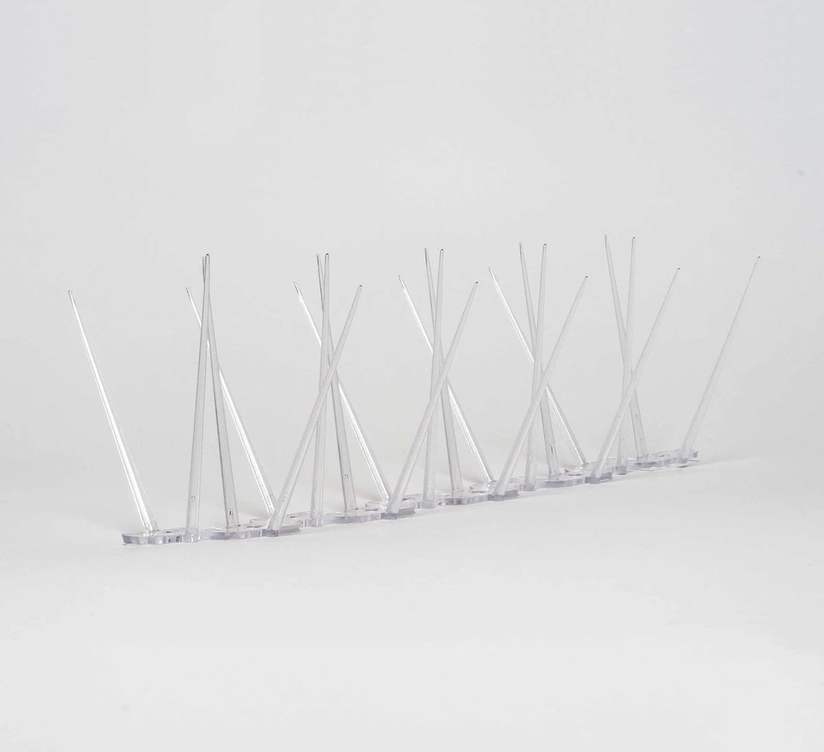 De duivenpinnen zijn op een 335mm lange strip van polycarbonaat kunststof aangebracht. De afstand tussen de pinnen bedraagt 32mm. Op de transparante en UV bestendige kunststof basisstrip bevinden zich in totaal 20 pinnen. De 110mm lange pinnen hebben aan de bodem een doorsnede van 3 mm en aan de top een doorsnede van 1mm.