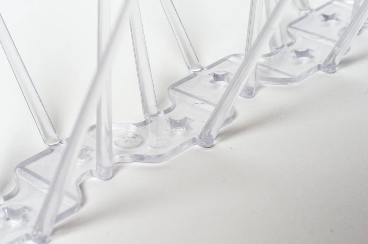 De kunststofstrip kunt u heel eenvoudig op nagenoeg elke ondergrond verlijmen met de transparante siliconenlijm Soudal Silirub2. Om de duivenwering jarenlang te kunnen garanderen zijn PRIXXS duivenpinnen uitgevoerd met UV bestendig Polycarbonaat waardoor effectieve duivenwering voor een periode van minimaal 10 jaar gegarandeerd is. Voor brede oppervlaktes kunt u meerdere rijen duivenpinnen parallel monteren.