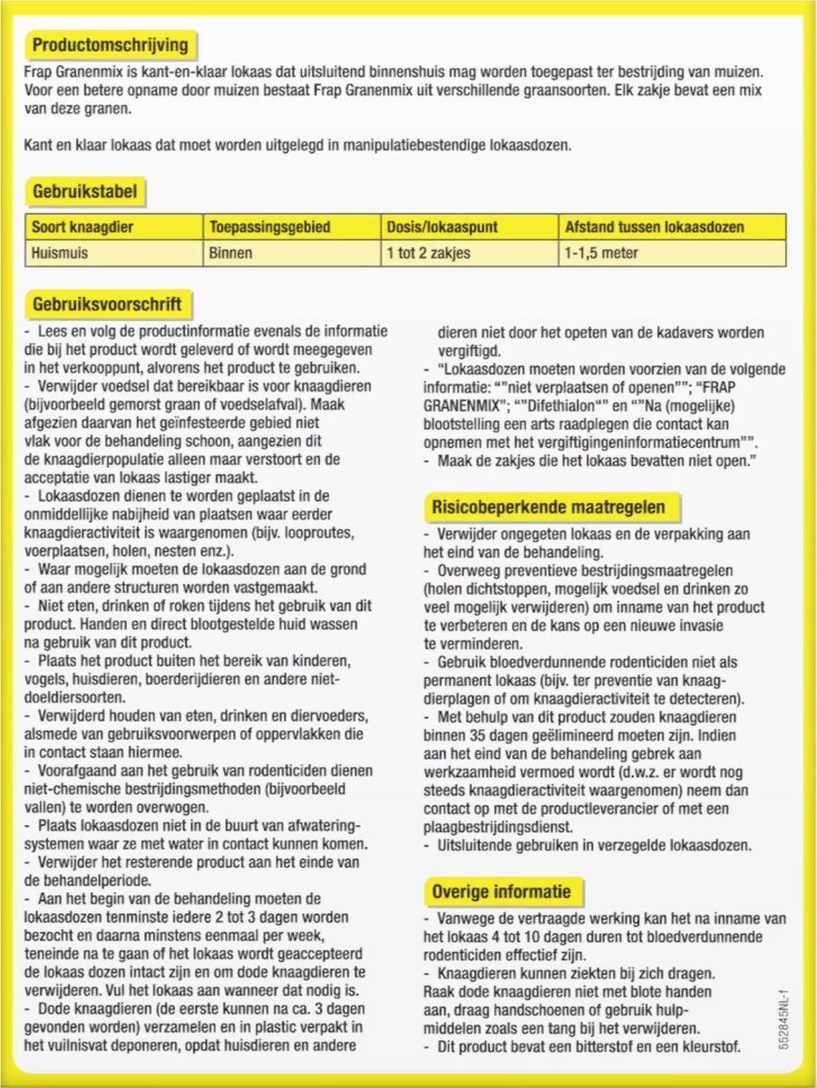 Protect Home Frap Granenmix is bestemd voor de bestrijding van huismuizen binnenshuis. Voor een betere opname door muizen bestaat Frap Granenmix uit verschillende graansoorten. Elk zakje bevat een mix van deze granen. In deze verpakking zitten 2 x 25 gram muizenkorrels in gesloten portieverpakking.