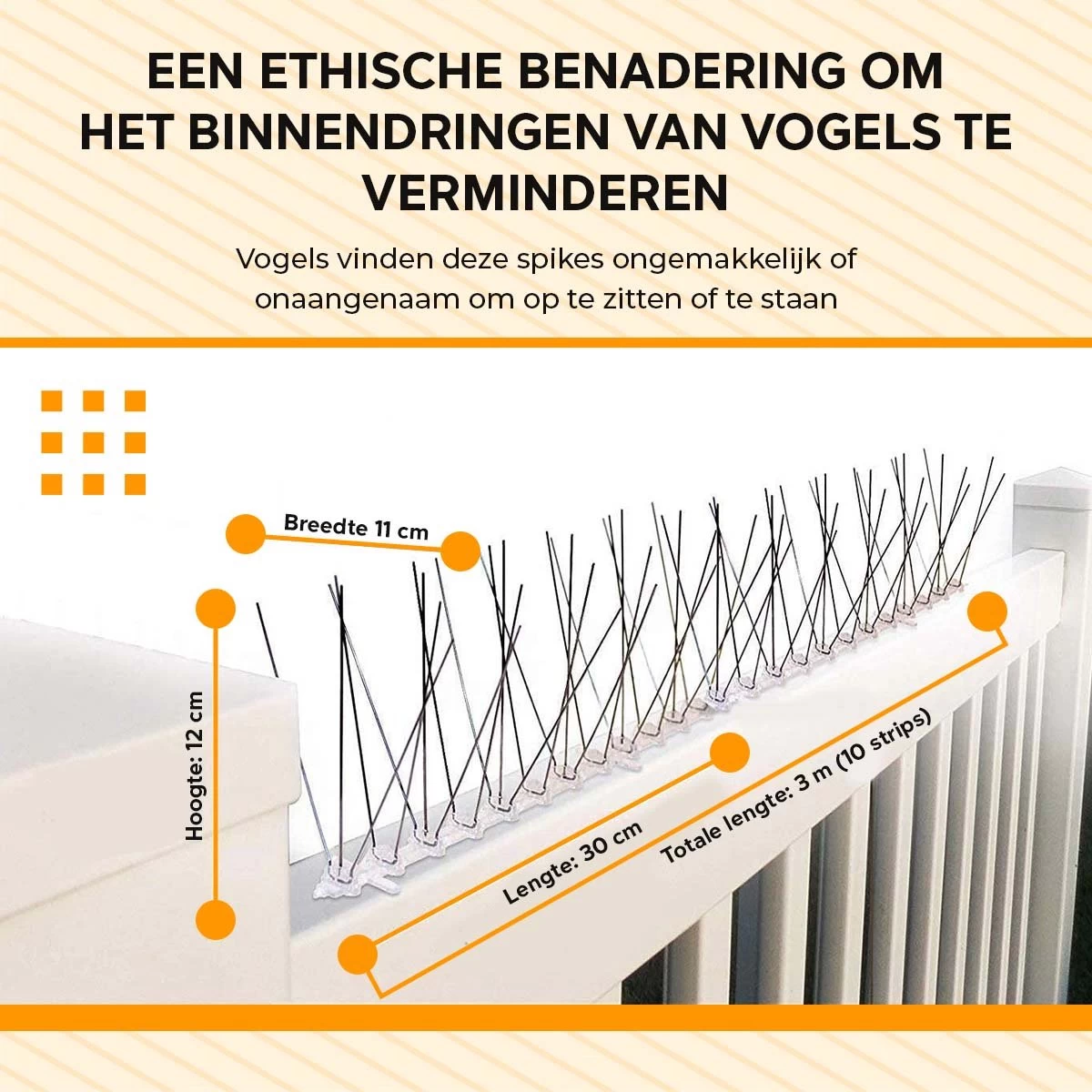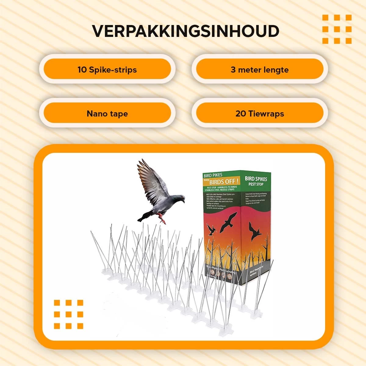 Het pakket bestaat uit 10 spike-strips, tiewraps en nano tape. Elke strip kan afzonderlijk worden gebruikt. Je kunt het zelfs in kleinere delen snijden om het in de kleinste ruimte te kunnen gebruiken. De zachte voet kan 360 graden worden gebogen, zodat de vogelbescherming goed past op gebogen of oneffen ondergronden zoals daken, open haarden, lamellen, goten, schuttingen, brievenbussen, balken, balkons, schuren en terrassen.