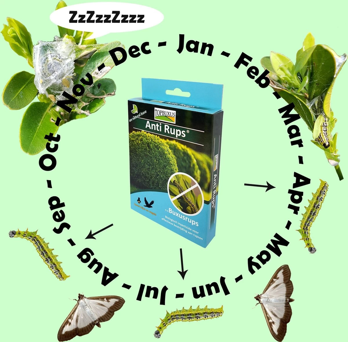 TOPBUXUS Anti Rups® stopt en voorkomt rupsenvraat in Buxus.