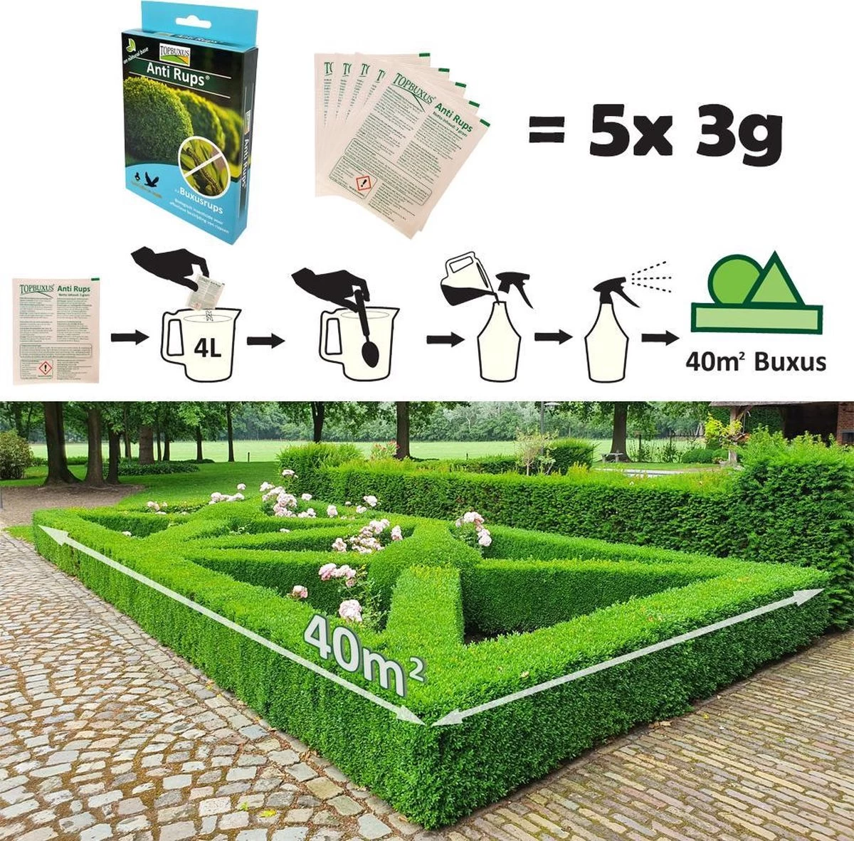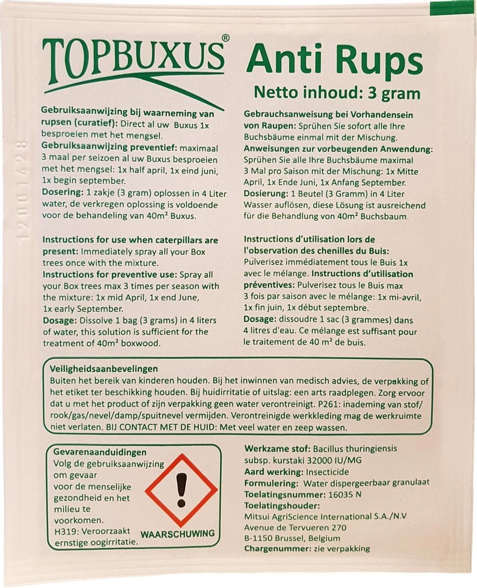 - TOPBUXUS Anti Rups® is 100% veilig voor mensen en andere dieren, zoals bijen en (jonge) vogels die de behandelde rupsen opeten.