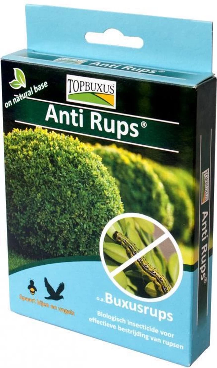 TOPBUXUS Anti Rups® is het nieuwe product tegen de Buxusrups, met toelating voor de Nederlandse markt. TOPBUXUS Anti Rups® is een biologische insecticide op basis van de Bacillus thuringiensis subsp. Kurstaki.