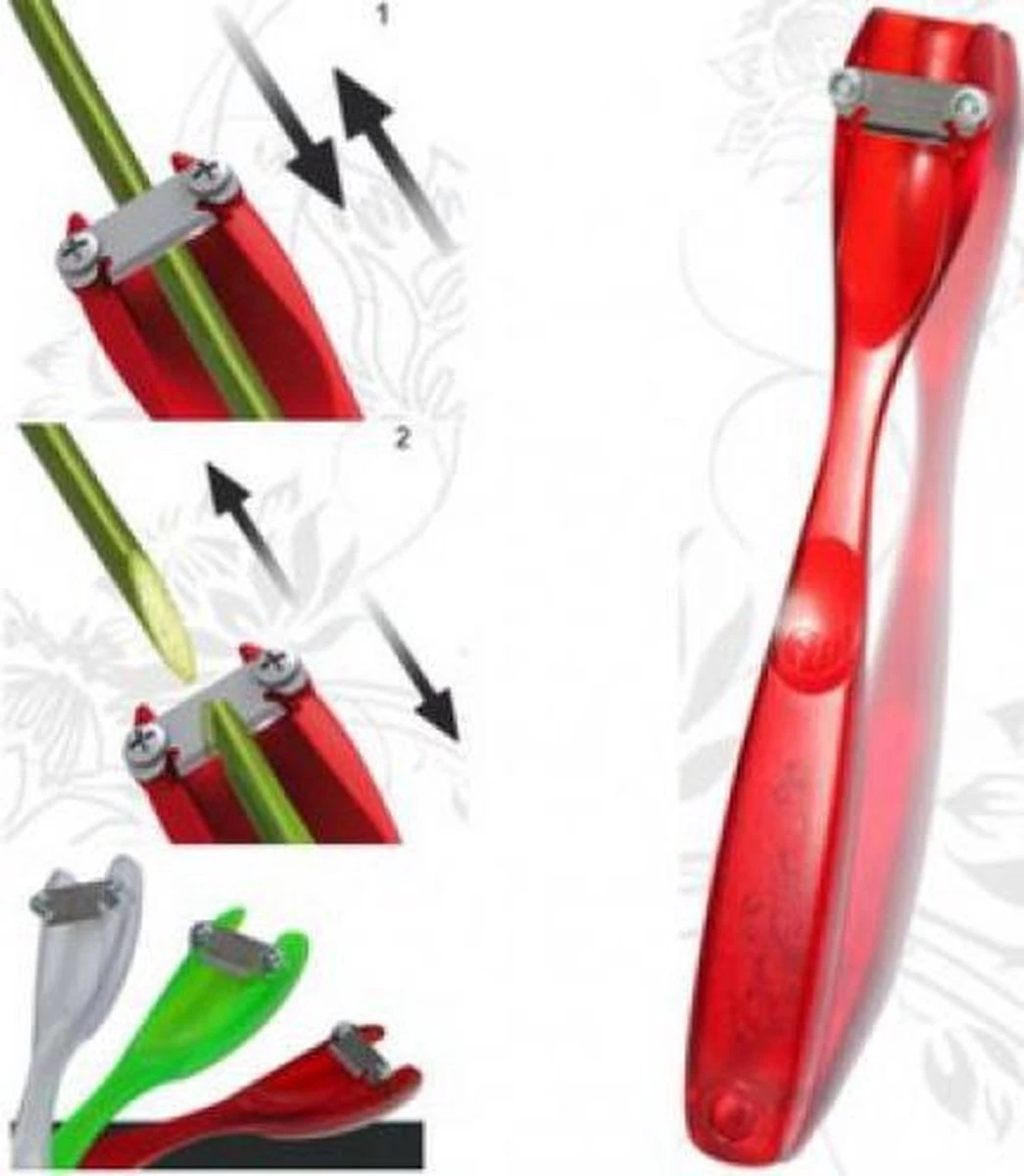 Een bloemensnijder is ideaal om heel eenvoudig de bloemen schuin af te snijden, ook voor de wat dikkere stelen! Schuif de bloemensnijder om de steel van de bloem op de gewenste lengte, trek eraan en de steel is perfect schuin afgesneden. De bladeren en eventuele doornen kunnen tegelijkertijd worden verwijderd. Bij een kant en klaar boeket is het daarom niet nodig om het helemaal uit elkaar te halen. Nog een voordeel: met deze bloemensnijder blijven je bloemen langer vers! Handig, makkelijk en snel. Eenvoudig bloemen schuin af te snijden.