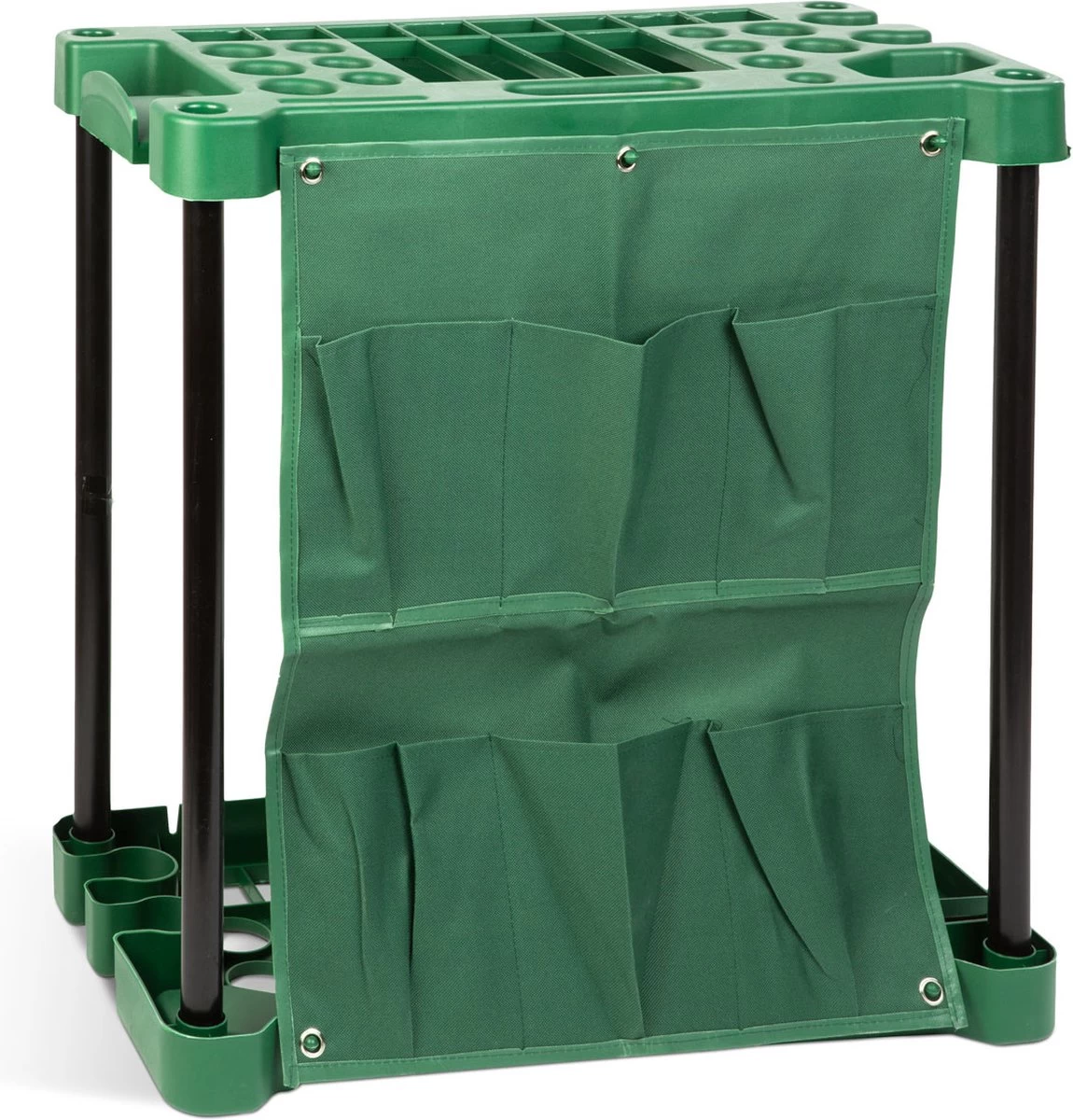 Grote tuingereedschaphouder geschikt voor het opbergen van gereedschap van elk formaat. Door de verschillende gatmaten vind je voor elk gereedschap de juiste plaats. Het kan geschikt zijn voor het opbergen van klein handgereedschap, zoals: snoeischaar, schroevendraaiers, pincetten, binders, schoffels, plantenbakken, enz… Je kunt de gereedschapshouder zelfs meenemen in de tuin, zodat al het gereedschap bij de hand is tijdens het werk, maar de console kan ook aan de muur worden bevestigd met behulp van de 4 haken (Schroeven en pluggen inbegrepen). In de linnen zakken aan de voorkant kun je ook ander gereedschap en apparatuur opbergen. Veelzijdig product dankzij zijn veelzijdigheid en wandmontage, alleen de verbeeldingskracht van het vullen van opbergvakken is beperkt.