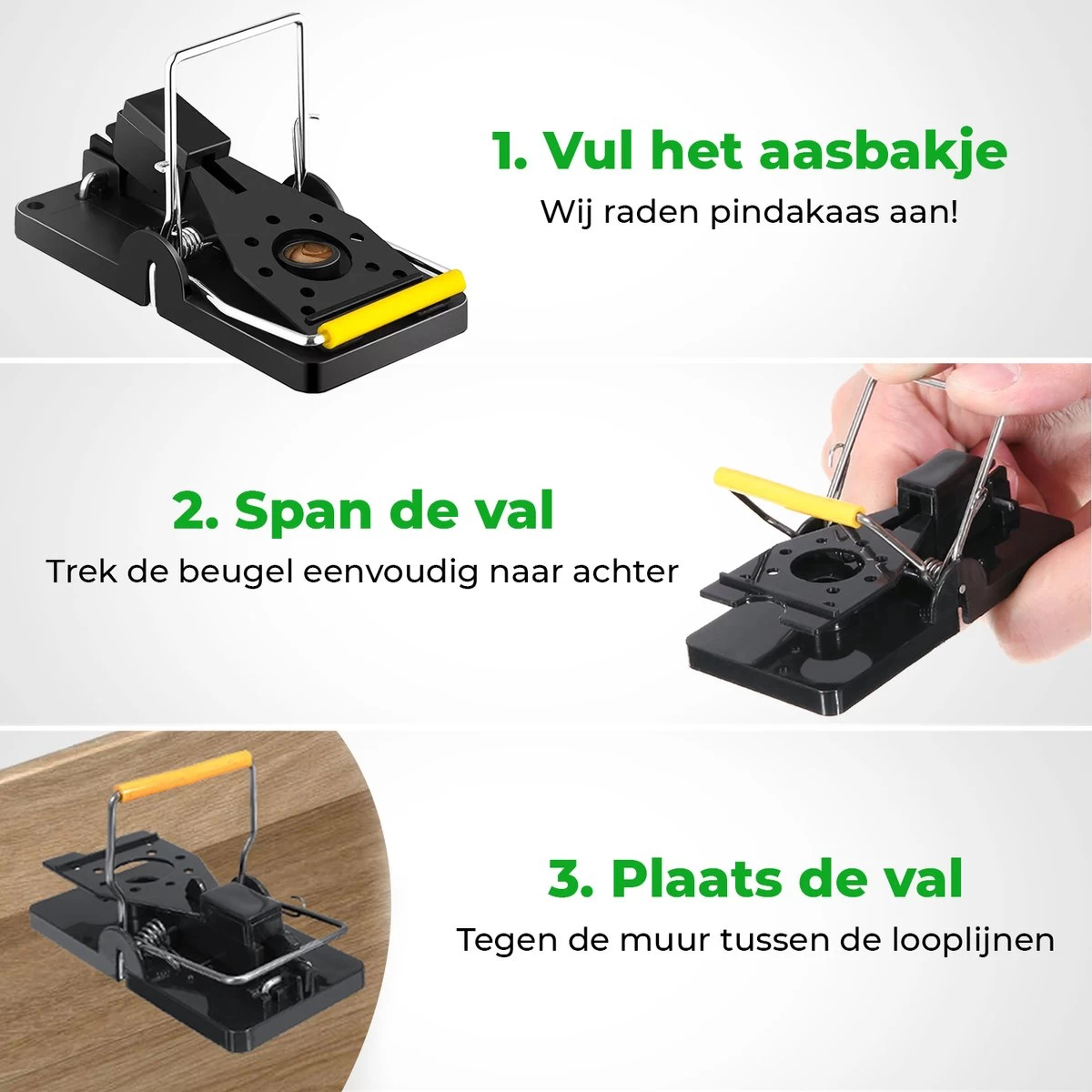 Het gebruik van de Muizenval is erg simpel. Volgens een aantal stappen maak je jouw terrein vrij van knaagdieren. Hieronder vind je het stappenplan.