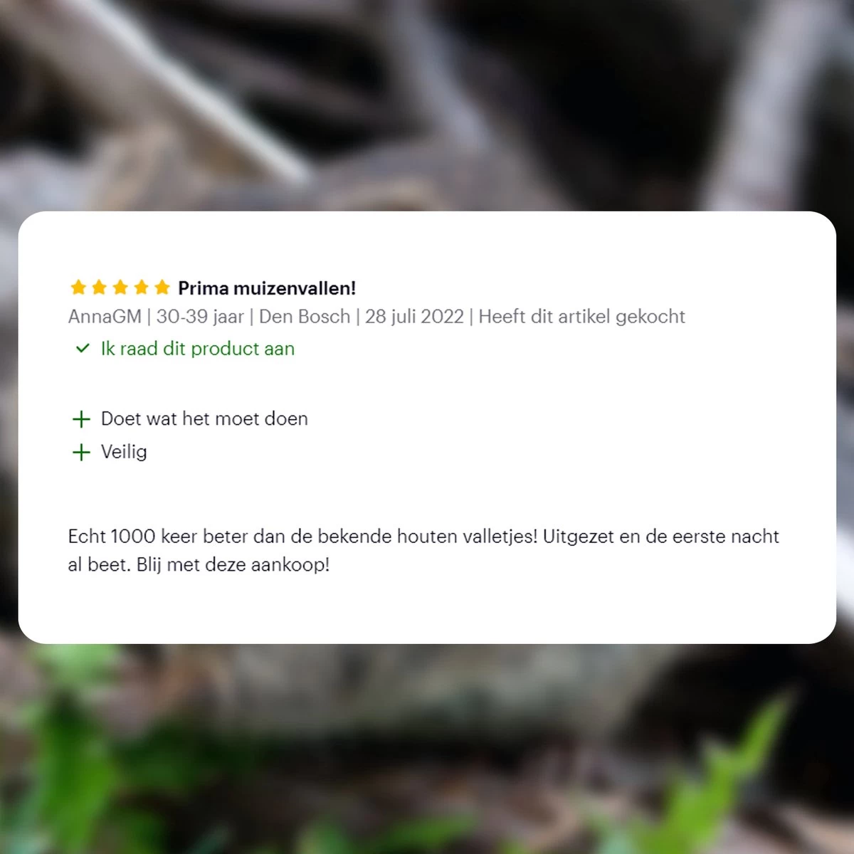 De Muizenvallen van VerminBuster beschikken over een extra sterke slagbalk. Dit vergroot de vangkans als de muis van het lokmiddel eet. Uiteindelijk zorgt dit ervoor dat je extra snel van het probleem met muizen af bent! Na vangst haal je de slagbalk naar achter en verwijder je de muis zonder aanraking.