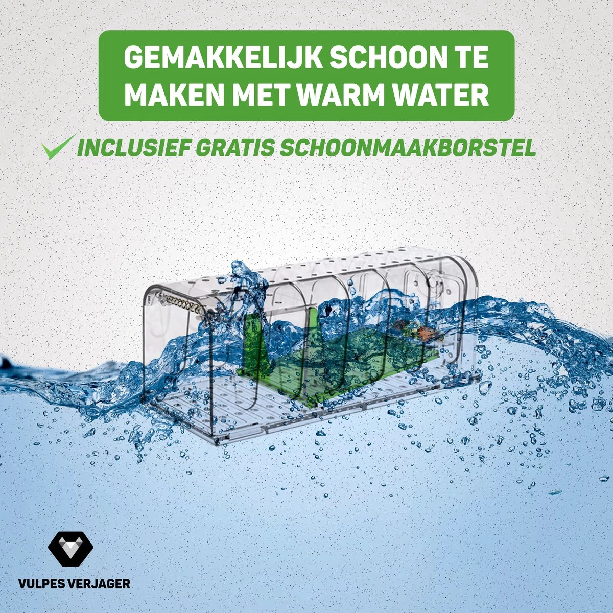 De muizenval is gemakkelijk te wassen met water en zeep, zo hou je hem goed schoon voor in huis. Je hoeft zo ook niet bang te zijn voor bacteriën van muizen of ratten wanneer je hem in je tuin hebt staan. Na een flinke beurt wassen met warm water en goede zeep is de muizenval weer helemaal schoon! Daarnaast bieden we je graag een handige schoonmaakborstel erbij aan voor extra hygiëne.