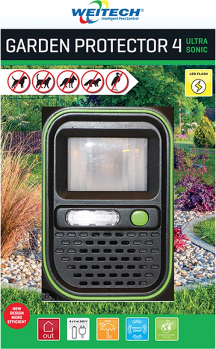 Verjaag honden, marters, katten, vossen en meer met de nieuwe Weitech WK0054 Garden Protector 4! Dit nieuwe model heeft een betere bescherming tegen regen en weer en beschikt verder over de gebruikelijke eigenschappen van de andere Garden Protectors. U kunt de frequentie in 7 stappen aanpassen van 14,3 tot 25 KHz zodat u verschillende soorten dieren kunt verjagen of gewenning kunt voorkomen. De sensor detecteert tot maximaal 14 meter in een hoek van 90 graden. Naast het ultrasone geluid gaat er ook een flitslicht af voor een extra schrikeffect.. De verjager werkt op 4 D batterijen en kan tot 5000 keer geactiveerd worden met goede batterijen. De verjager kan ook op netstroom werken met een adapter. Batterijen en adapters zijn niet meegeleverd, maar kunnen wel mee besteld worden. Exclusief bevestigingsmateriaal. Merk Weitech Samenvattend Sterke buitenverjager. Met aanpasbare ultrasone geluiden en flitslicht. Werkt op batterijen of een flitslicht. Snel van het ongedierte af met de Weitech WK0054 Garden Protector 4!