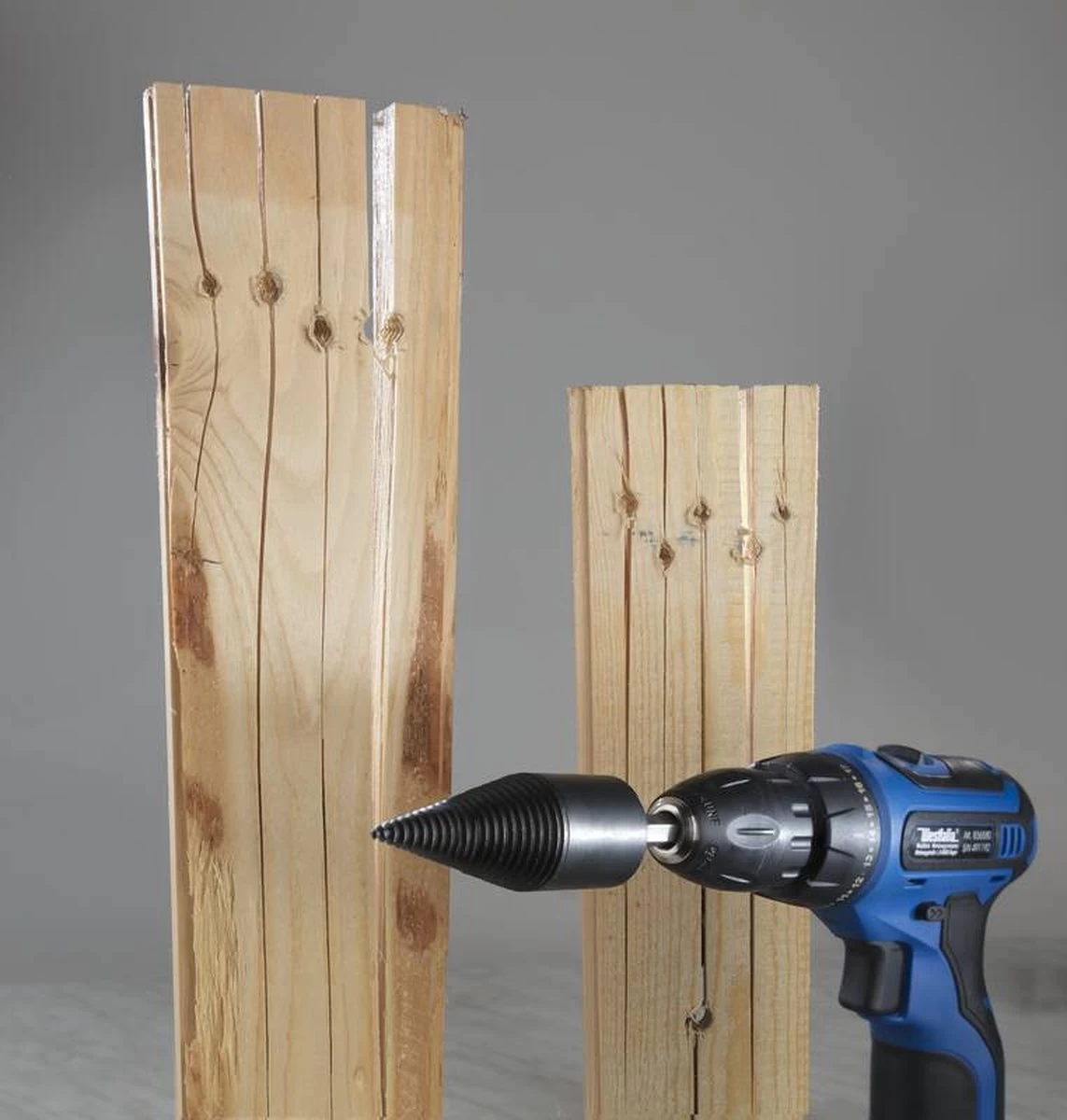 De praktische zeshoekige bevestiging zorgt ervoor dat de kloofboormachine gemakkelijk op een accuboormachine of snoerboormachine kan worden gemonteerd en onmiddellijk klaar is voor gebruik. De splijtkracht die wordt uitgeoefend hangt af van het vermogen van de boor. Met een conische kloofmachine kan brandhout in verschillende maten worden gesplitst.
